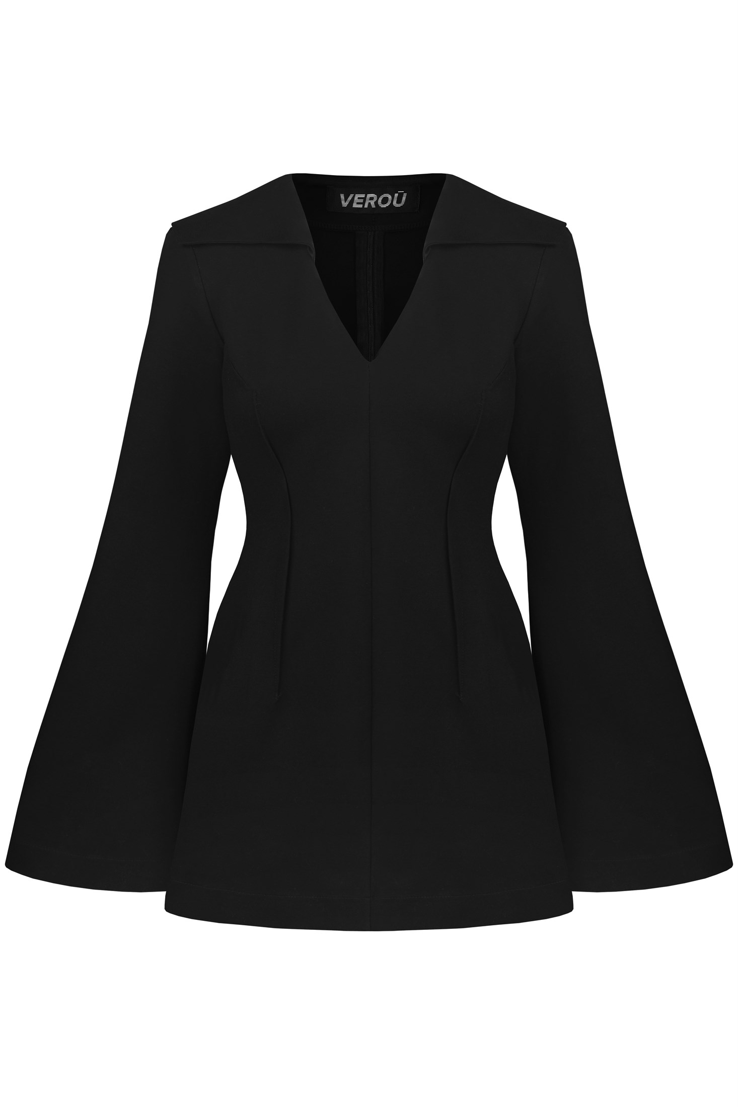 Современная интерпретация классики — элегантное черное мини-платье из плотного джерси с V-образным вырезом и отложным воротником. Приталенный крой гармонично сочетается с расклешенным подолом и длинными рукавами-клёш. Вертикальные наружные вытачки формируют изящный силуэт, а застежка-молния на спинке обеспечивает удобство и идеальную посадку.