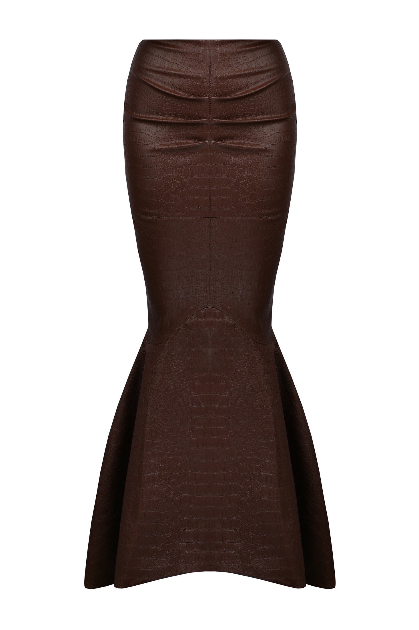 Эффектная юбка макси, выполненная из высококачественной эко-кожи с выразительным кроко-рельефом. Глубокий коричневый оттенок подчеркивает благородство фактуры, а силуэт «рыбка» мягко повторяет линию бедра и раскрывается к низу, формируя чистый, вытянутый силуэт.